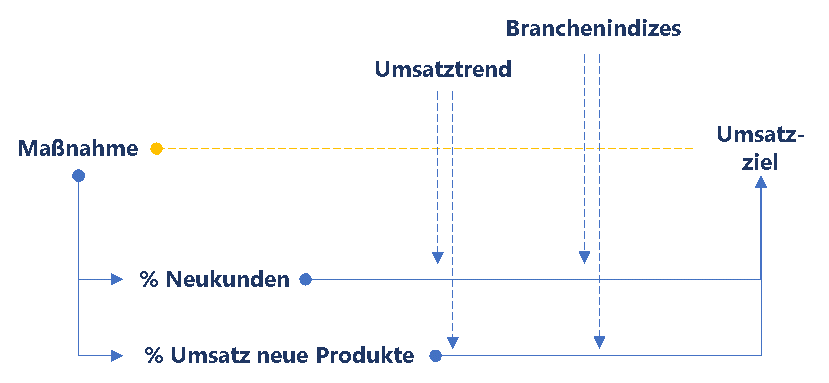 Danach versuchen wir Messgrößen zu identifizieren, die unmittelbar mit der Umsetzung der Maßnahme zu tun haben und mittelbar mit unserer Zielgröße. Bei einer Umsatzmaßnahme könnte das z. B. der Anteil von Neukunden oder der Umsatz mit neuen Produkten sein. Wichtig ist an dieser Stelle, dass die Maßnahme im besten Fall diese Kenngrößen unmittelbar beeinflusst oder zumindest beeinflussen kann.