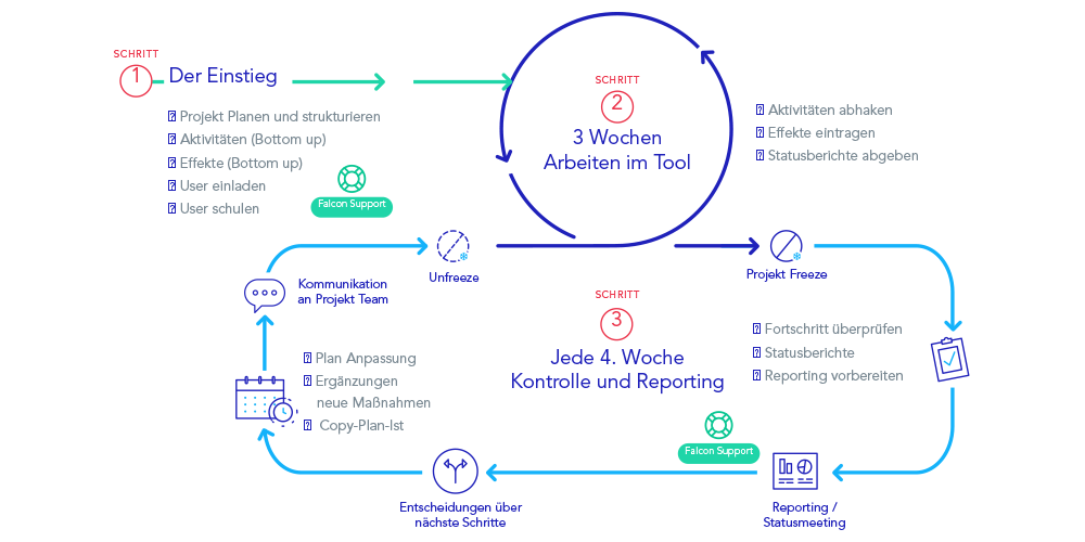 Es gibt kaum etwas Wichtigeres für das Management Ihrer Maßnahmen als die quasi-religiöse Verfolgung des sog. Reporting-Zyklus. Nur mit dieser Regelmäßigkeit können Maßnahmen durch das PMO gut begleitet werden, und Probleme können zeitnah angegangen werden. Ein sehr gängiger Ansatz ist ein monatliches Berichtswesen (so wie nachstehend gezeigt).