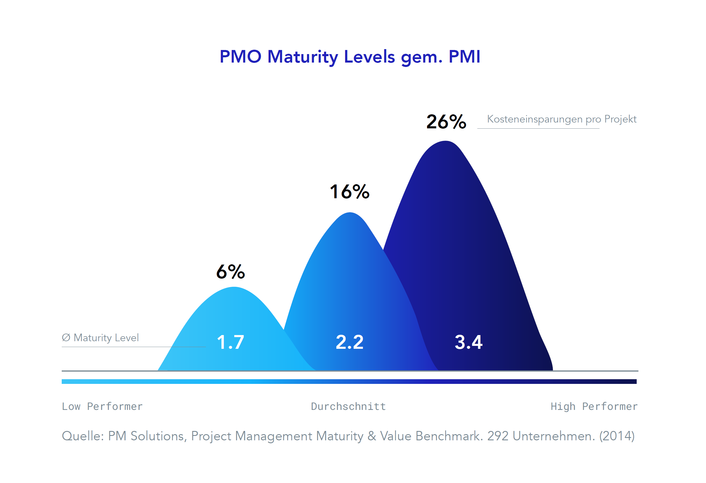 Die untenstehende Grafik zeigt, dass die Kosteneinsparungen und der Nutzen, den Unternehmen pro Projekt erzielen, mit dem Reifegrad des PMOs prozentual steigen. Es kann sich also auch finanziell lohnen, ins PMO zu investieren und das Maturity Level, bzw. den Reifegrad, zu erhöhen. Ein linearer Zusammenhang lässt sich allerdings nicht erschließen. Auch zeigte sich, dass es ab Level 2 zunehmend schwieriger und aufwendiger wird, die nächste Stufe zu erreichen.