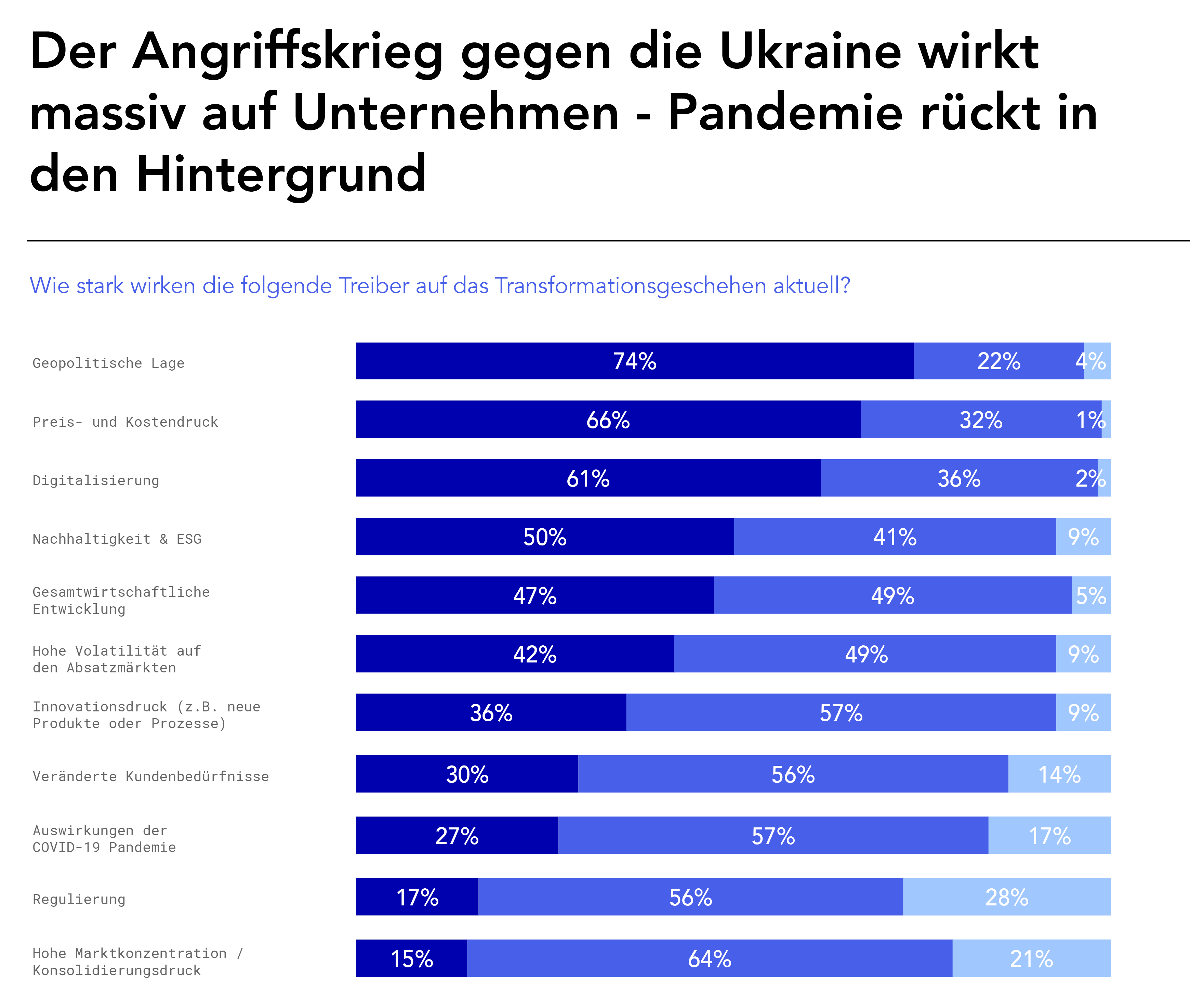 - Steigende Forderung von allen Stakeholdern nach der Transparenz, die ESG Faktoren offenzulegen und nachhaltig zu managen. Auch in unserer diesjährigen #SHIFTHAPPENS2022 Studie wird wieder deutlich, dass veränderte Kundenbedürfnisse zu den Haupt-Transformationstreibern zählen. Transparenz im ESG Bereich dürfte dabei ein wichtiger Faktor sein.