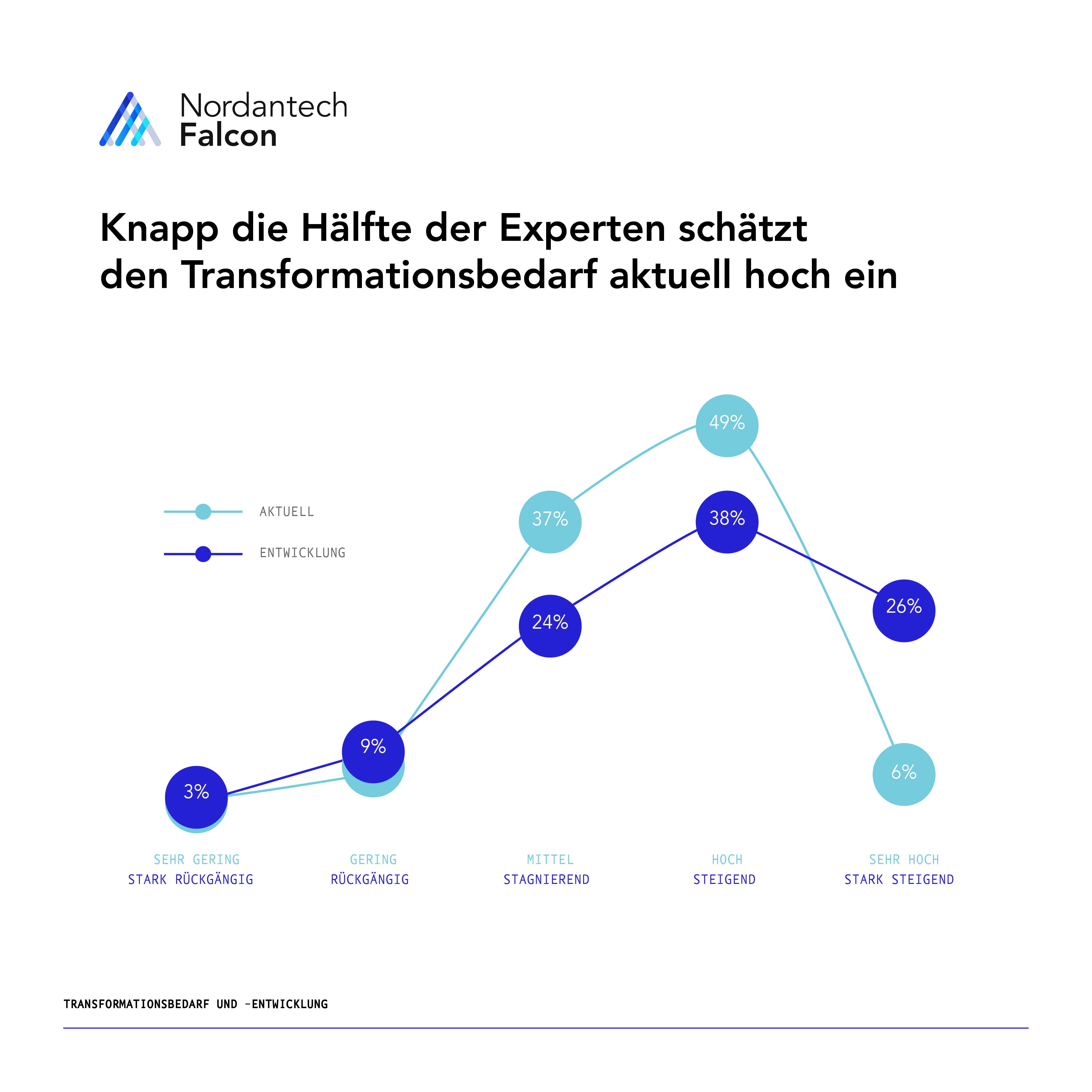 Diese Krisenstimmung scheint sich auch im aktuellen Transformationsbedarf widerzuspiegeln. Knapp die Hälfte der Befragten schätzt den aktuellen Transformationsbedarf als hoch ein. Und sogar ein weiterer Anstieg ist zu erwarten.