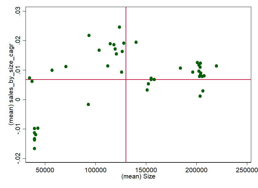 A simple way to get a feel for the performance and path dependency of the stores over time is the growth rate. Since we know that stores have relatively similar patterns during the year, we can use the annual CAGR=0) as an indicator. To get a feel again, we plot the growth rate versus the size. To be able to classify the whole thing better, we add the averages:
