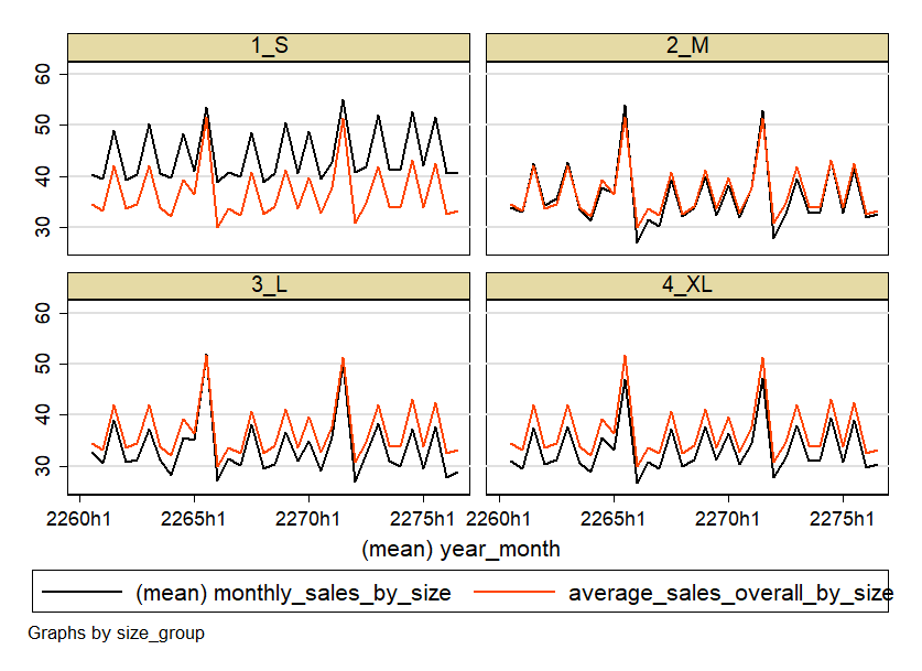 So now we have the groups S, M, L and XL. Ok, let's take a look at the store types over time and relativize them to the sales area of the stores. In the sense of relativization, we can also take a look at the stores on average - then you can compare better. Here we go: