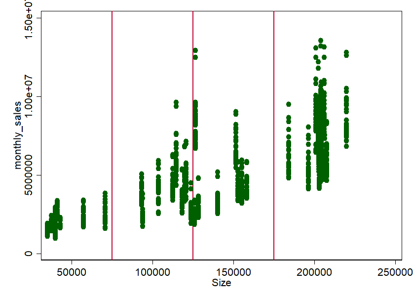 And for the first time, we have already stretched out the feelers in the direction of "measures". Now we could identify why some stores perform so unbelievably well and why some don't (all under CAGR=0). In particular, the smaller stores seem to record negative growth rates despite high space efficiency in the three year period.