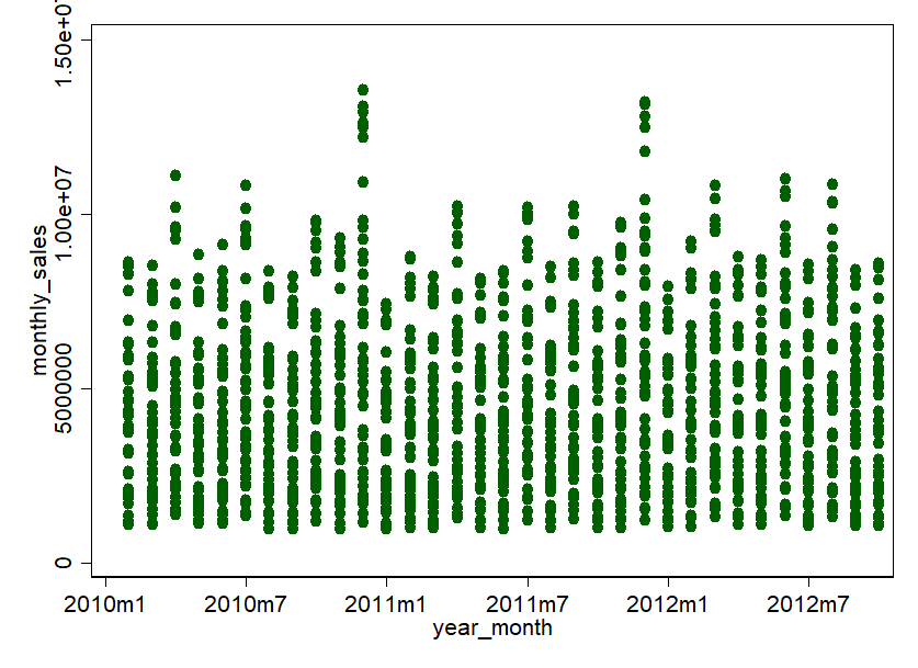 In such cases, the "main road" principle applies first. So, do without details and start one or two levels before. So we aggregate our Walmart data to months and to stores. Departments, weeks and days can also be viewed later. To get a feeling for the data, a visualization is usually the first step. How about this: a scatterplot of the monthly turnover per store over time.