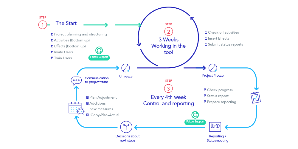 The project cycle helps in establishing a successful routine for project portfolio work and will immediately increase the team's performance. There is hardly anything more important than the quasi-religious pursuit of this cycle. Only with this regularity can the project be well accompanied by the PMO, and issues can be addressed in a timely manner. Experience shows that without a strict cycle, transformations are almost always doomed to failure because they fall asleep. So make sure to choose a cycle and format (e.g. a monthly steering committee with C-Level involvement, PMO, and all project sponsors) that fits your needs. Find more on this very important step here.