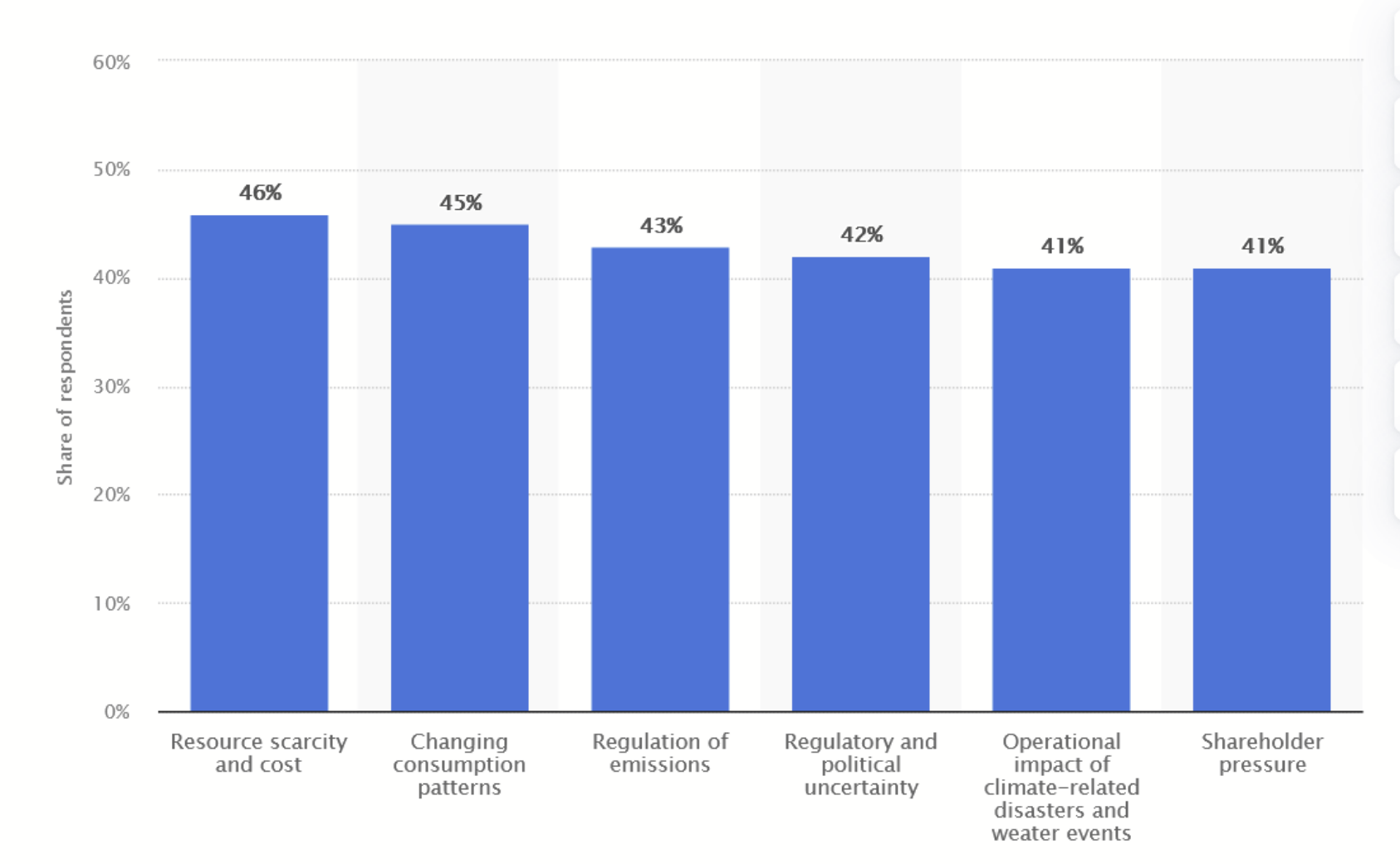 A global survey conducted between September and October 2022, encompassing over 2,000 C-level executives worldwide, revealed that businesses have already experienced the repercussions of climate change. According to the findings, 46 percent of respondents identified resource scarcity and cost as significant challenges affecting their operations, with changing consumption patterns closely following as a key concern.